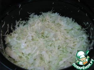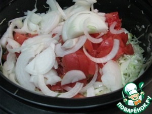 Вы можете приготовить любой гарнир, а я приготовила в мультиварке капусту с томатами и луком. Для этого я нашинковала (в комбайне) капусту и посолила ее со специями. Выложила в чашу и оставила для того, чтобы выделился сок. томаты очистила от шкурки (для этого крест-накрест надрезала, опустила в кипяток и сразу в холодную воду. Шкурка сама сползает.