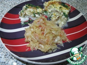 Блюдо приготовила спонтанно. Муж принес шикарную треску. Оригинальное получилось блюдо. Для рыбных "гурманов". неожиданное. Для людей не употребляющих мясо- находка, поскольку полноценный белок. За счет яблока и гренок, нет "специфического" рыбного запаха. Поскольку рыба готовилась в духовке, мультиварка была свободна и я приготовила гарнир, из тушеной капусты, томатов и репчатого лука, без "традиционной" моркови. Блюдо не "совсем" бюджетное, но вполне можно сказать "диетическое". Если кто-то повторит мое изобретение и не будет меня "ругать", буду благодарна! Но и на критику "постараюсь" отреагировать адекватно.