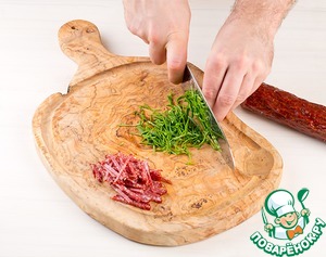 Колбасу «Деликатесную по-черкизовски» нарезать соломкой, перемешать с рублеными листьями базилика.