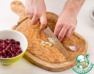 Консервированную фасоль процедить, выложить в глубокую миску, добавить измельченный чеснок.