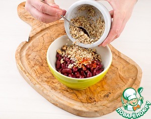 Грецкий орех необходимо размолоть. Добавить в миску лук, перец чили, молотый грецкий орех и дать настояться 10 минут.