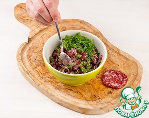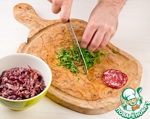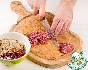 Колбасу сырокопченую «Брауншвейгская черкизовская» тонко нарезать кусочками, далее соломкой, смешать с подготовленным лобио, оставив 3 кусочка на оформление.