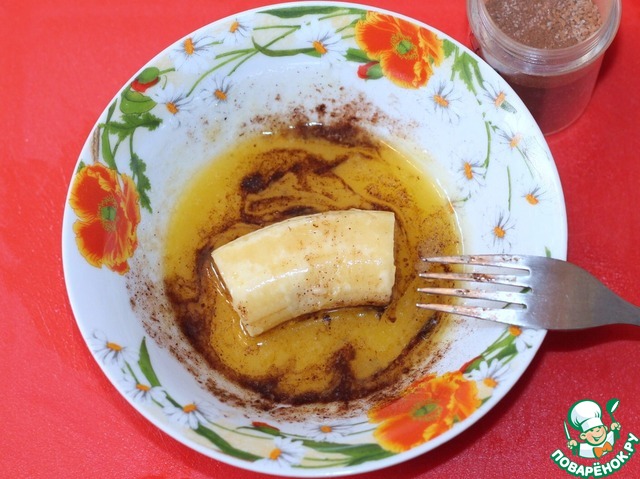 Смешать мед с соком лимона, и корицей. Можно добавить немного сливочного масла (1 ч. л.). Поместить кусочки банана в медовый маринад на несколько минут.