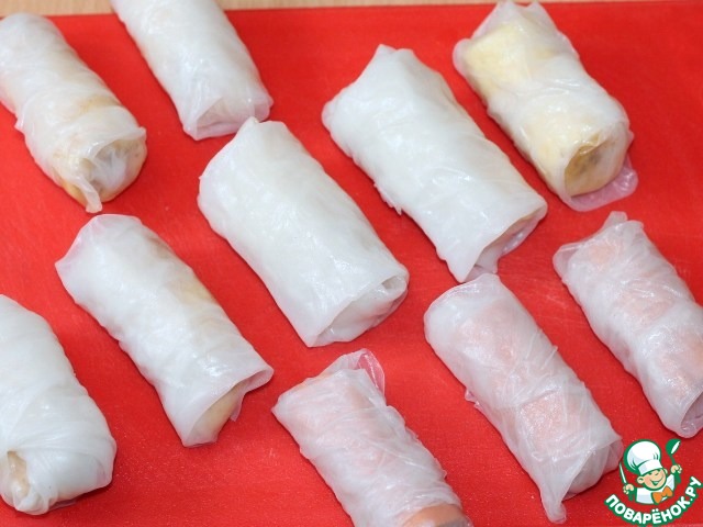 Я попробовала завернуть половинки сосисок в рисовой бумаге.