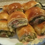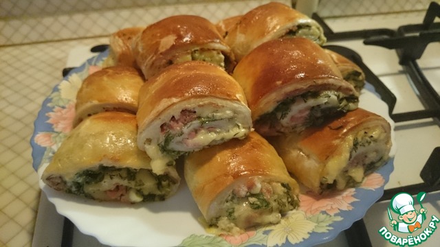 Рецепт "Слоеные рулетики с колбасой и сыром":