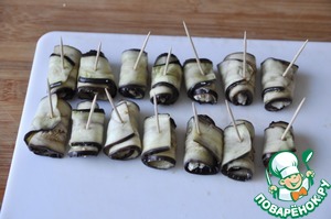 Сворачиваем баклажан рулетиком и скрепляем зубочисткой.