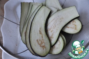 Баклажаны солим и оставляем на 10 минут, чтобы вышла горечь.