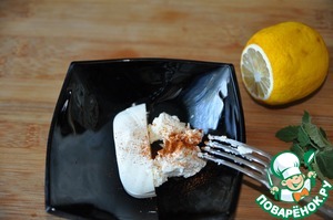 Берём творожный сыр и фету, добавляем сок лимона, красный жгучий перец и мелко нарезанную зелень мяты. -
