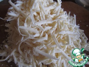 Сыр натереть на крупной терке. Подойдут такие сорта, как "Российский", "Голландский", "Костромской" - все, которые хорошо плавятся.
