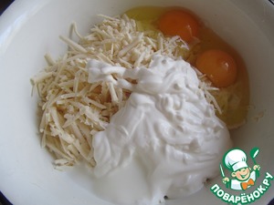 К сыру добавить яйца, сметану, соль, разрыхлитель и муку. С солью будьте аккуратны, так как сыр может быть достаточно соленый.