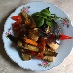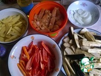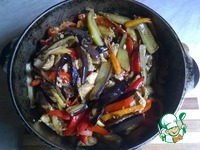 Обжарить все ингридиенты по отдельности. В малом количестве масла. Смешать все в казане и тушить на маленьком огне 5 минут. |
