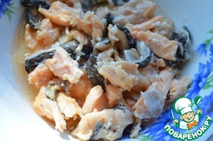 С помощью вилки размять семгу (жидкость с консервы не сливаем)