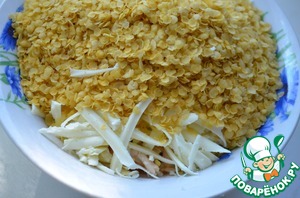 К семге добавить тертый сыр, пшенные хлопья Мистраль, посолить по вкусу, перемешать