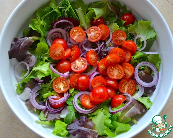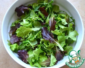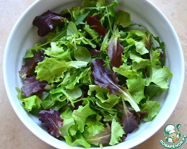 Салатный микс как следует промыть и осторожно высушить. Выложить листья салата в большую миску-салатницу. -