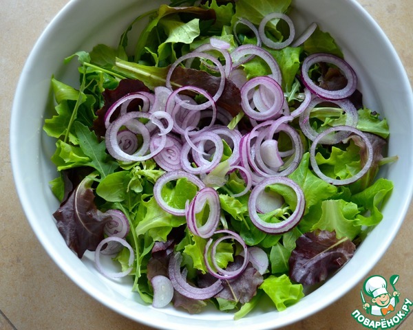 Красную луковицу очистить и очень тонко нарезать кружочками или полукольцами. Добавить к зелени.
