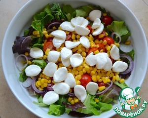 Моцареллу нарезать небольшими кубиками и выложить в салат. У меня на этот раз такие маленькие моцареллы..., "ушки"! ))
