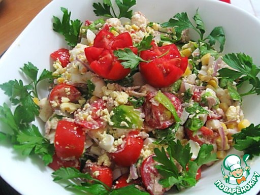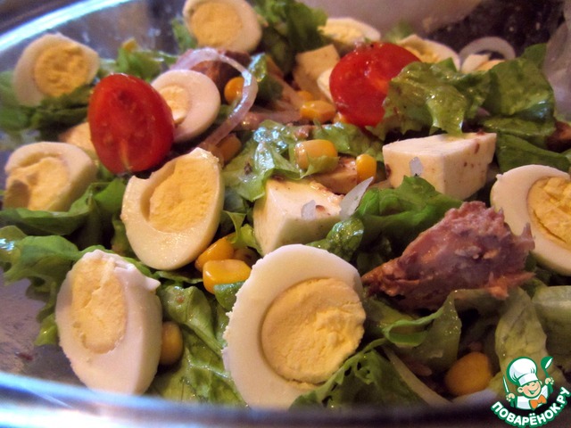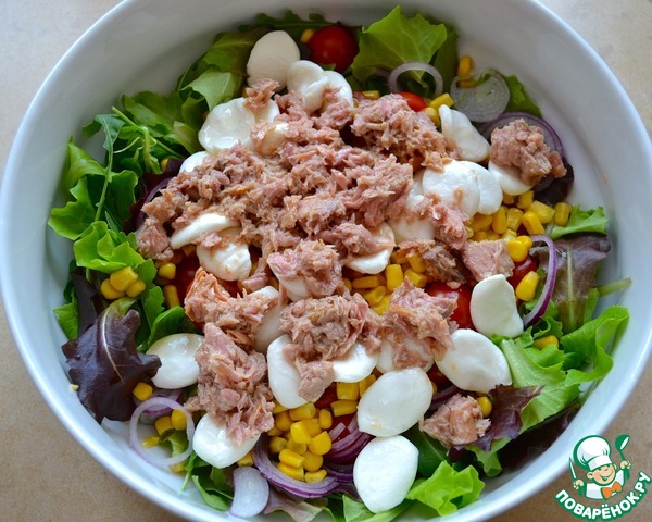 Слить лишнее масло с консервированного тунца и тоже добавить в салат.