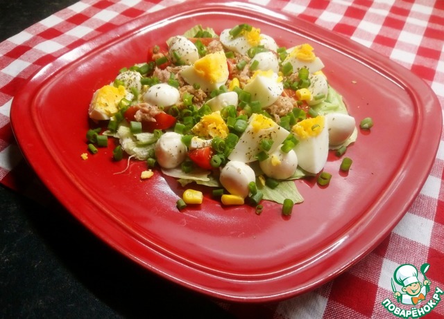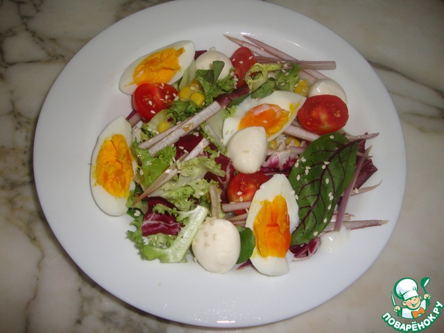 А можно, разложить салат по тарелкам и сверху выложить "дольки" яиц. По Вашему усмотрению! )))