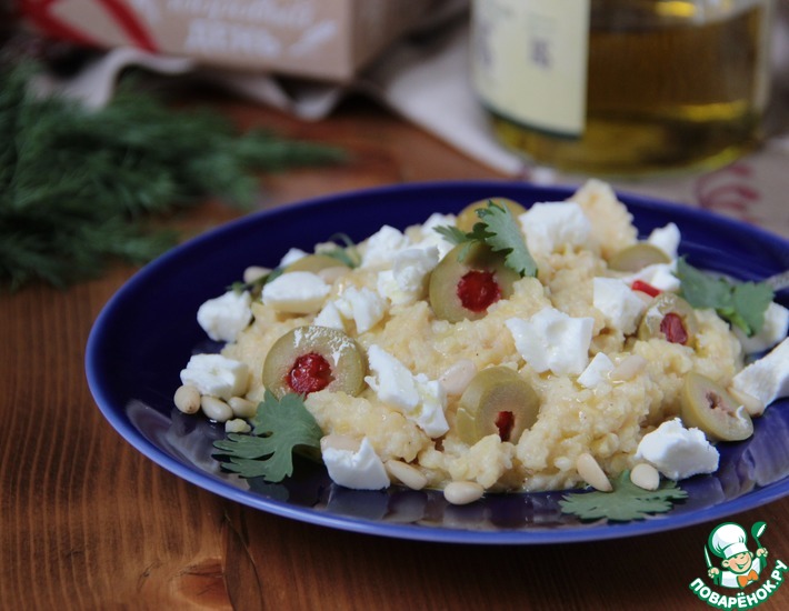 Сытное и быстрое блюдо из пшенных хлопьев с добавлением оливок и сыра. Такой пикантный вариант понравится всем, кому надоели сладкие каши!