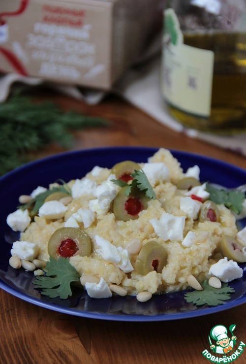 В каждую порцию каши добавить оливки, фету, кедровые орешки и зелень (у меня кинза), полить оливковым маслом.