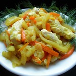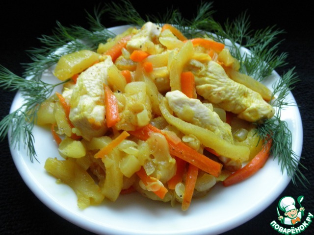 Сочное свежее пикантное рагу с нежнейшей куриной грудкой. Прочитала в дневнике Ольги Демурия, что никак не найдет любимого рецепта с куриной грудкой, захотелось поделиться своим вариантом. Готовиться довольно быстро и результат замечательный. Моя детка уплетает с удовольствием, да и мы в восторге. Оля, этот рецепт посвящаю тебе, надеюсь, что понравится.