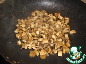Режем крупно грибы, обжариваем до готовности, перекладываем к мясу.