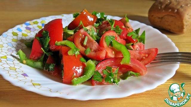 К помидорам добавить болгарский перец и петрушку, влить заправку и аккуратно перемешать. Убрать в холодильник на 10 минут.