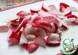 Редис нарезать дольками не очень мелко.
