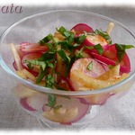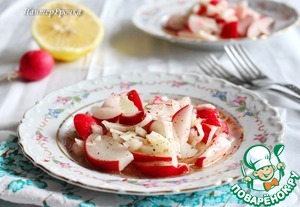 Нашла рецепт на иностранном сайте под названием "Анти-старение". Под ним стояло примерно следующее описание: "Хотите защитить свою кожу от преждевременного старения и выглядеть моложе, не используя дорогостоящих кремов и косметических процедур? Тогда стоит обратить внимание на целебные продукты, способствующие улучшению состояния кожи, благодаря наличию в них ряда витаминов и питательных веществ. Эти питательные вещества увлажняют кожу изнутри, выводят токсины, восстанавливают коллаген. Что это за целебные продукты? Редис, лимон, оливковое масло, лук и мед. Все они содержатся в этом салате". От себя добавлю, что салат имеет пикантный вкус и идеально подходит в качестве закуски к шашлыку.