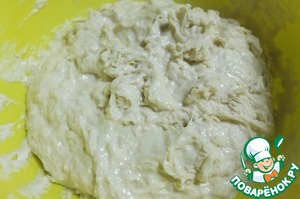 Добавляем теплую воду с дрожжами, перемешиваем до однородной липкой массы. Накрываем чистым полотенцем и оставляем подходить в теплом месте, примерно на час.