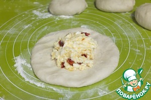 В центр лепешки кладем начинку (примерно столовую ложку с горкой). -