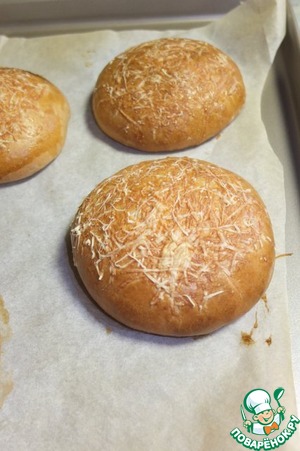 Смазываем булочки яйцом и посыпаем натертым на мелкой терке пармезаном. -