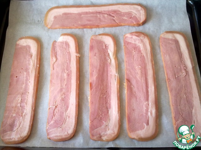 Противень застелите пергаментом, разложите в один слой бекон. Поставьте в разогретую до 180 градусов духовку на 8 мин.
