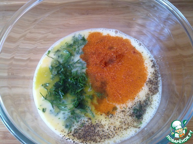 Приготовьте омлет. Яйца взбейте с молоком, добавьте измельченный укроп, посолите, поперчите по вкусу. (Если у вас есть особенно любимые специи – кориандр, мускатный орех, добавьте их омлет – он приобретет приятный аромат и пикантный вкус.)
