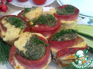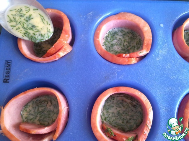 Внутрь каждой формочки с беконом аккуратно ложкой влейте яичную смесь. Поставьте в разогретую до 180 градусов духовку и запекайте еще 15 минут.