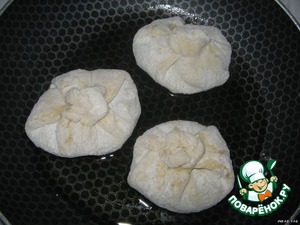 Мешочки обжариваем на растительном масле с двух сторон. С той стороны, где были защипы - будет розочка.