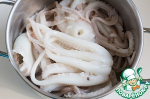 • 1. Осьминога промыть, отрезать голову, удалить внутренности и клюв. Промыть еще раз, постаравшись по максимуму смыть слизь. Если осьминог крупный, то его лучше отбить для мягкости. Сложить осьминога в полиэтиленовый пакет и отбить резиновым молотком или молотком для мяса. Ошпарить осьминога и убрать свернувшуюся пленку. Можно предварительно осьминога не ошпаривать и не очищать, особенно, если он свежий и не очень крупный. Тогда осьминог получается красного цвета. Осьминога нарезать средними кусочками (одного я оставила для украшения).