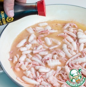 • 3. Добавить нарезанного осьминога, влить соевый соус и тушить около 10 минут на среднем огне, иногда помешивая. Осьминоги должны пустить достаточно воды, но, если этого не произошло, можно добавить немного воды.
