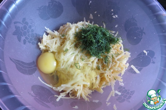 Моем и чистим картофель. Трем на крупную терку. Добавляем яйцо и измельченный укроп. Перемешиваем и солим.
