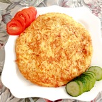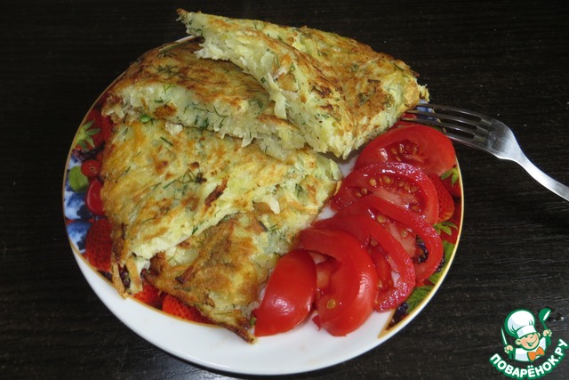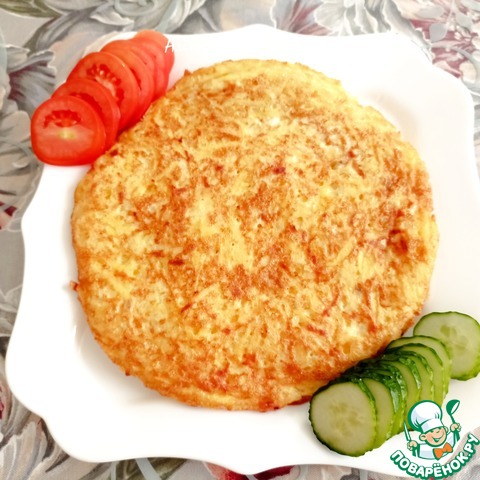 Разогреваем сковороду. Растапливаем на ней сливочное масло и блинчиком выкладываем нашу картофельно-яичную массу и немного приминаем. Жарим с двух сторон до румяной корочки.