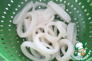 Кальмары, я использовала кольца, опускаем в кипящую воду на 2 мин. Смываем под холодной водой.