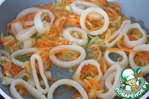 На сковороде обжариваем лук с морковью. Добавляем кальмары.