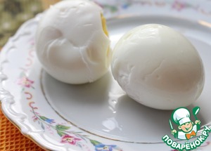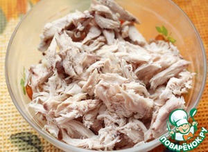 Отварить филе в микроволновке. Для этого положить курицу в посуду, пригодную для СВЧ, и залить кипящей водой, чтобы она полностью покрывала филе. Закрыть крышкой и довести до кипения. При мощности 1000 Вт на это уйдет 3-4 минуты. После закипания варить 10 минут до готовности. Готовую курицу разобрать на волокна. (Совет: Чтобы ускорить процесс, филе можно нарезать на небольшие кусочки.)