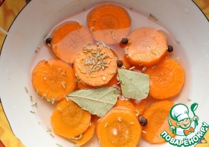 Морковь почистить и нарезать тонкими кружочками. Залить небольшим количеством воды, добавить соль, перец горошком, лавровый лист и розмарин. Готовить в микроволновке при мощности 1000 Вт 2-2.5 минуты.