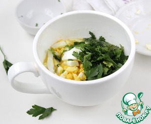 Для соуса к рыбе, вареные яйца очистить, измельчить. Нарезать зелень.