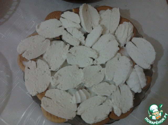 Зефир резать как можно тоньше на пластинки и выложить слой на печенье. Смазать сметаной.