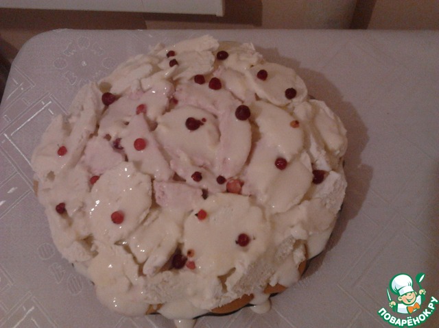 На следующий слой зефира я выложила вишню. Можно клюкву, малину, клубнику. С бананом не сочетается, с яблоками или апельсином можно. Но апельсин горчит. С ананасом не пробовала.