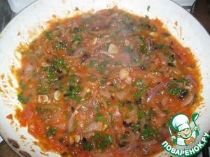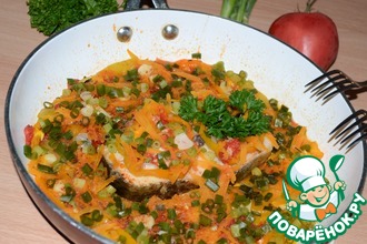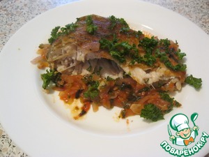 Добавить измельченную зелень к помидорам, перемешать. Через 1-2 минуты выложить на овощи поджаренную рыбку. Накрыть крышкой. На минимальном огне готовить по 5 мин с каждой стороны. Отключит огонь и дать постоять 10 мин под крышкой.