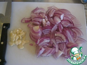 Лук порезать полукольцами. Я каждую половинку разделила еще на пополам. Чеснок пластинками. Обжарить 7-10 мин на среднем огне.