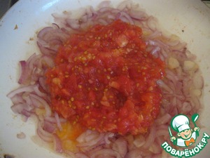 Помидоры обдать кипятком, снять кожицу и мелко порезать. добавить к луку и чесноку. Посолить, поперчить. Накрыть крышкой и тушить, убавив огонь до минимального, 10 минут